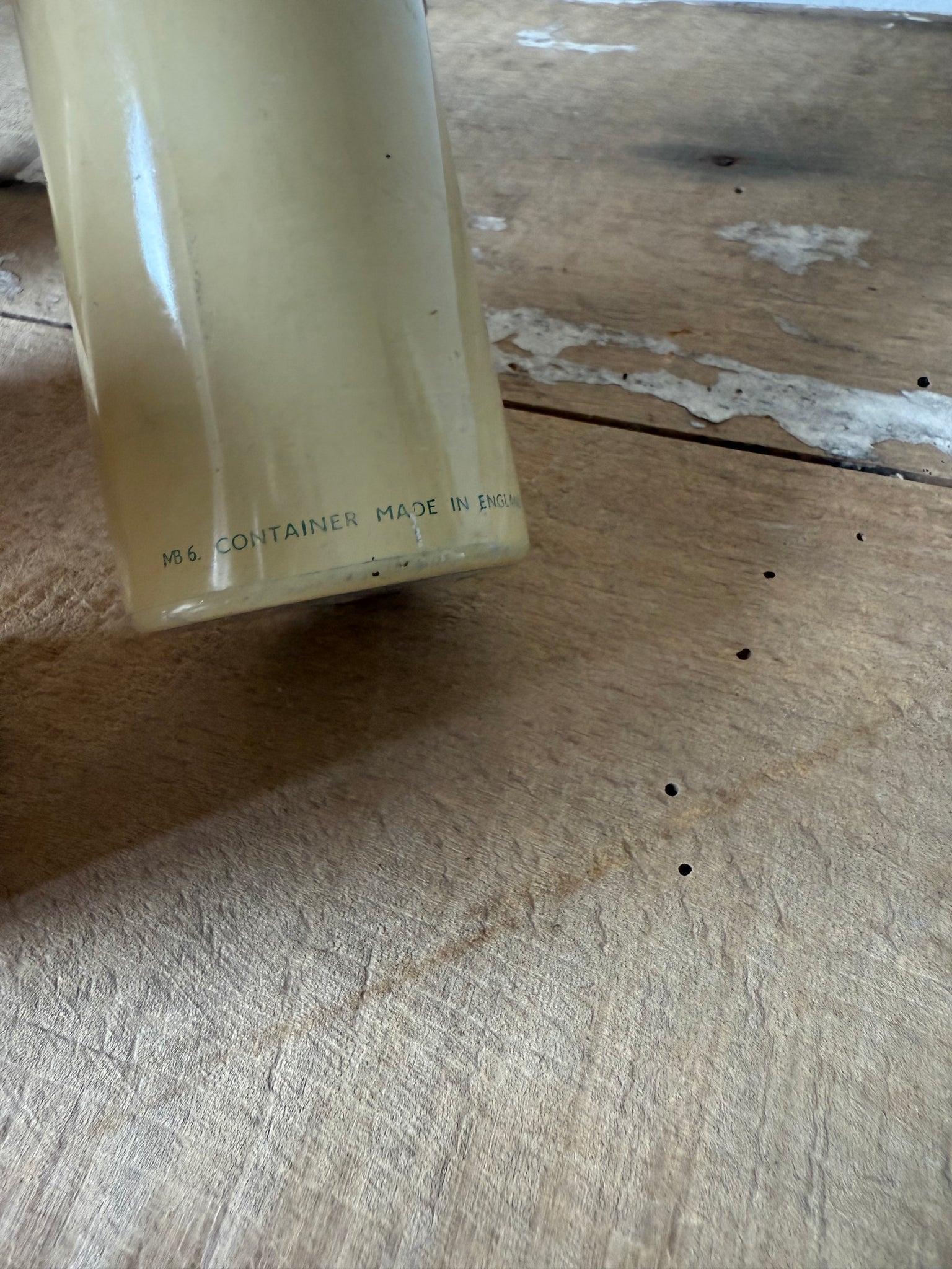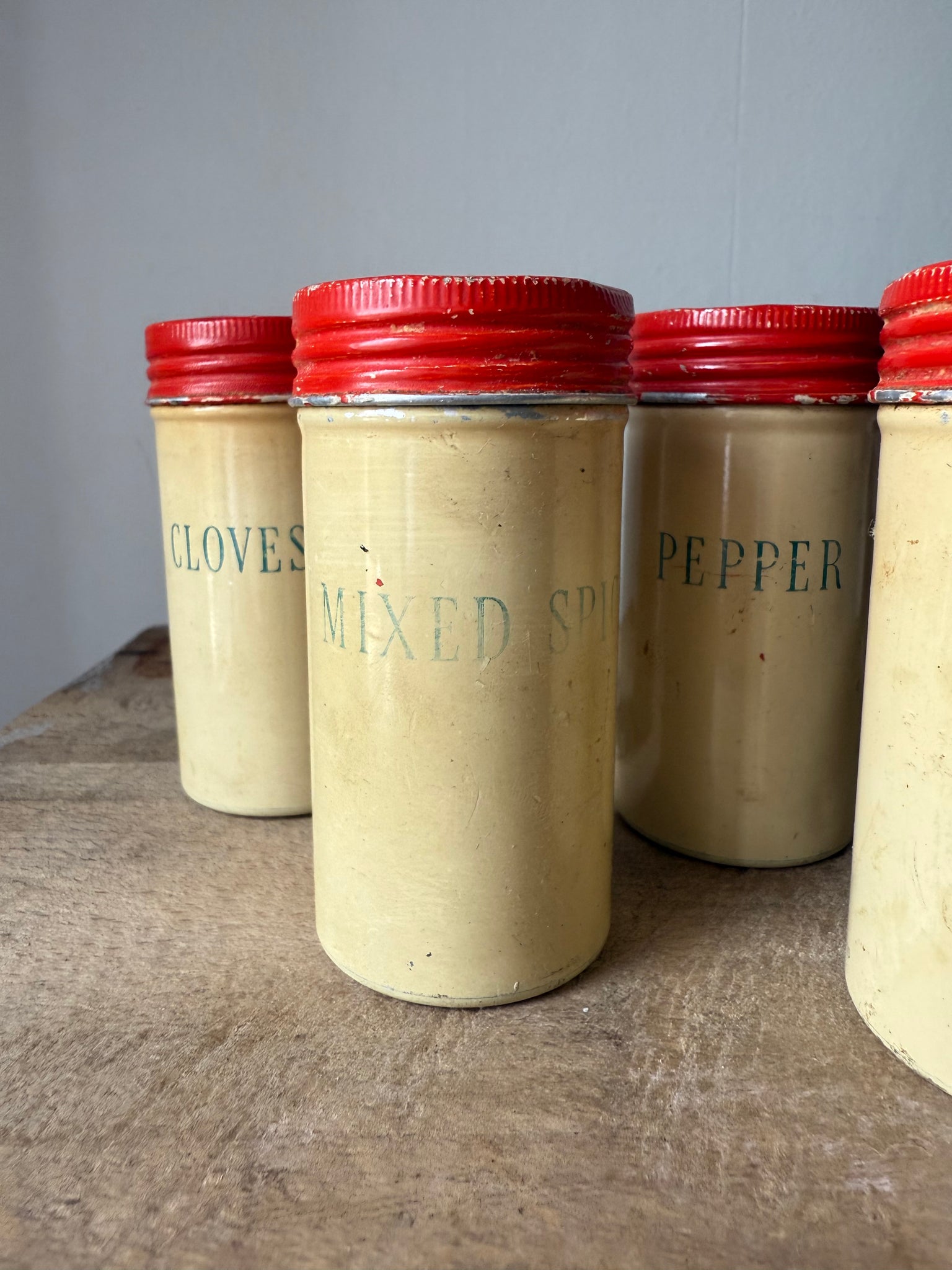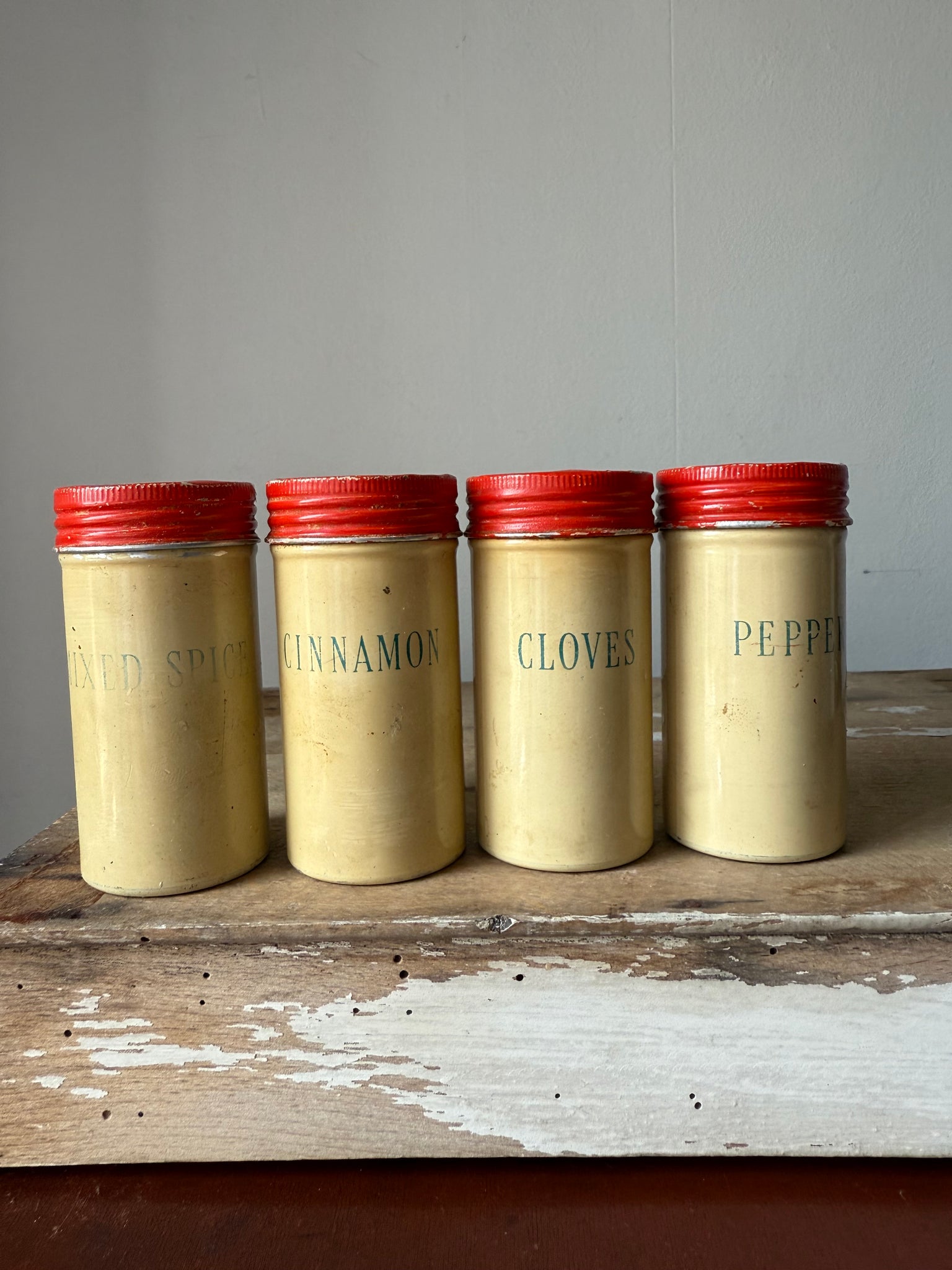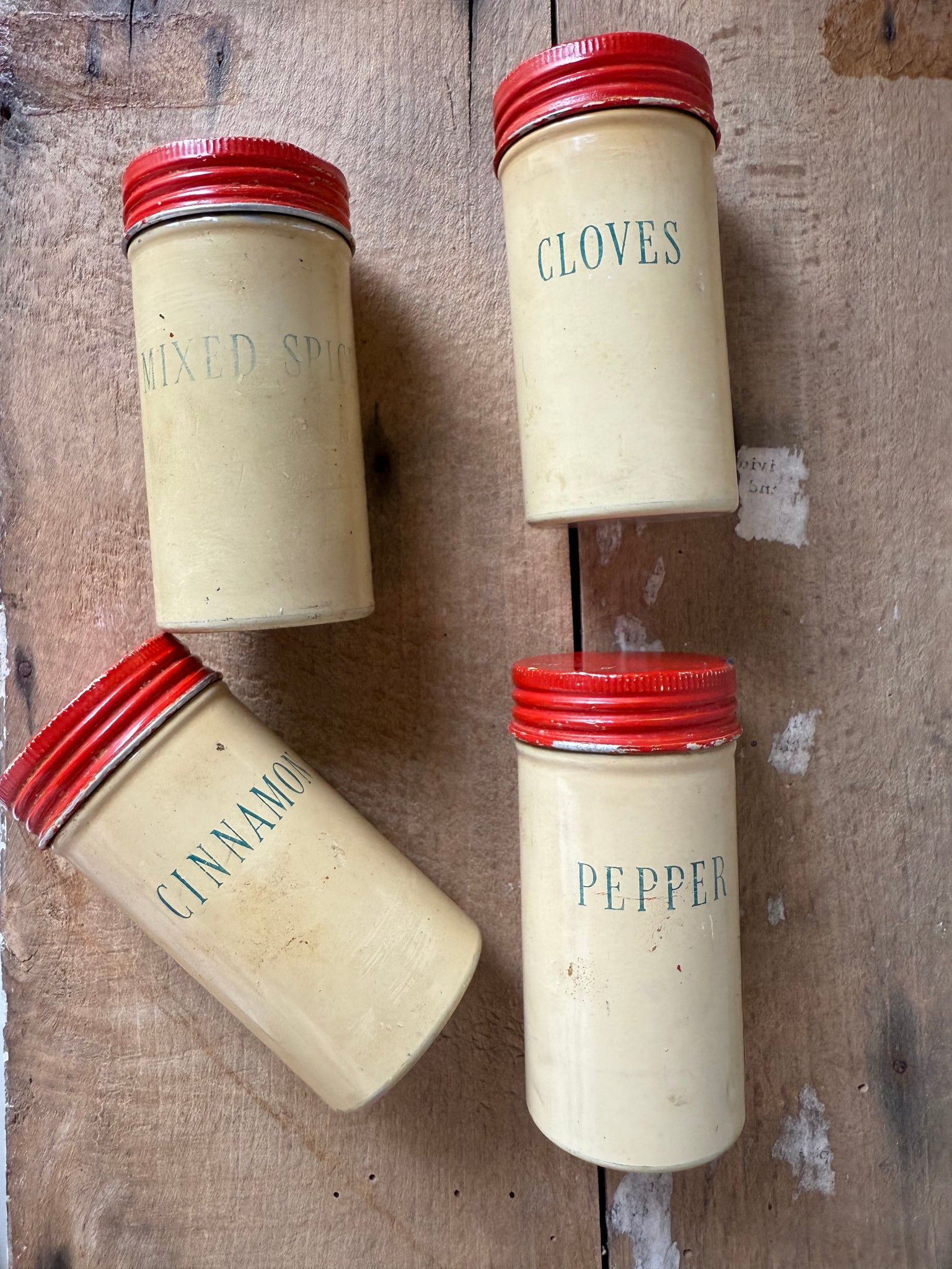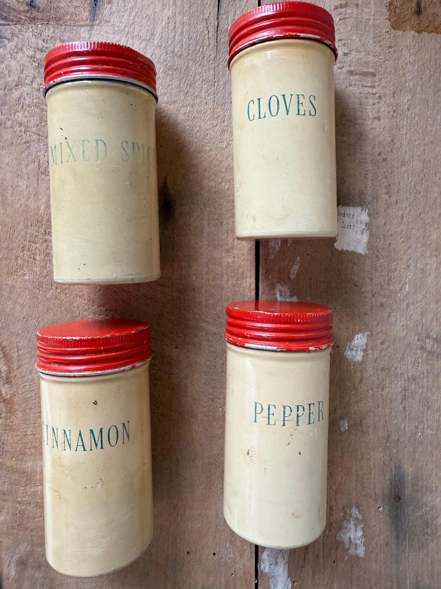A set of four vintage spice tins: cloves, cinnamon, pepper, and mixed spice. With red lids and gorgeous faded blue type. They have some great wear and would look fantastic staples in a kitchen.